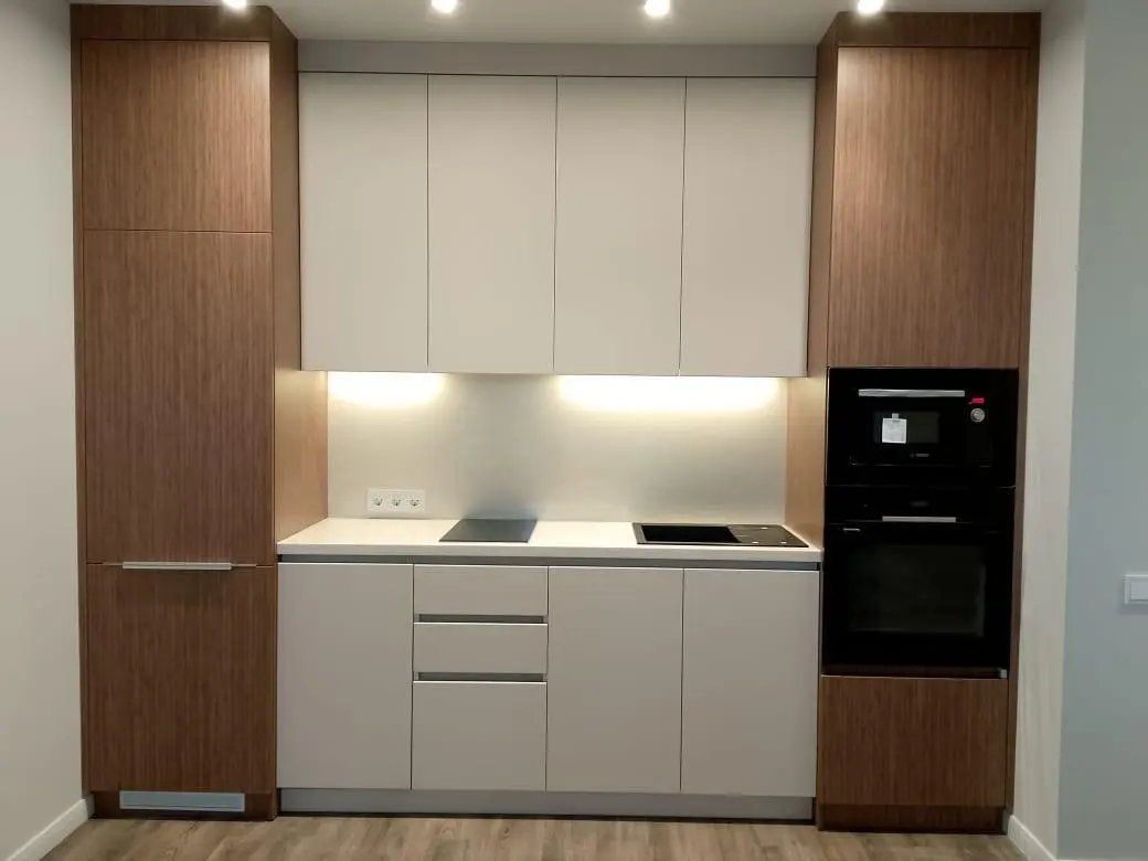 Прямая кухня — самый простой вариант для небольших помещений и студий. Она хорошо подходит, когда кухонная зона расположена вдоль одной стены и вы хотите оставить место под стол или диван. Минус — меньше рабочих поверхностей и хранения, поэтому важно продумать высокие шкафы и грамотную «начинку».