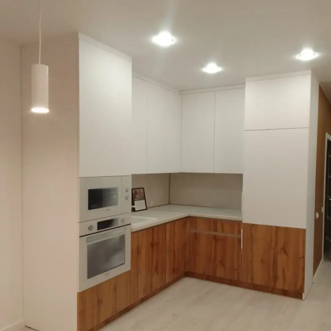 Угловая кухня — самый универсальный вариант, поэтому ее часто выбирают для типовых тюменских квартир: где кухня отдельная, прямоугольная или близкая к квадрату. Формат хорошо работает и в новостройках, и во вторичном жилье, потому что позволяет использовать две стены и получить больше рабочей поверхности.