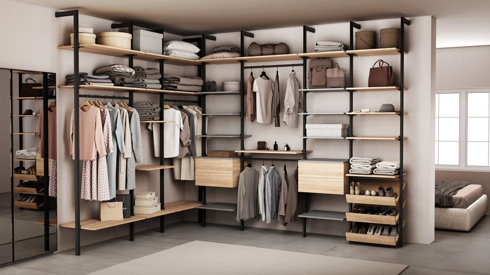 Практический критерий: если у вас уже стоит 2–3 отдельных места хранения (шкаф, комод, тумбы) и все равно тесно, то единая система часто оказывается эффективнее. Внутри гардеробной можно собрать штанги, ящики, полки и «хозяйственный» блок в одном месте — это снижает потребность в другой корпусной мебели.